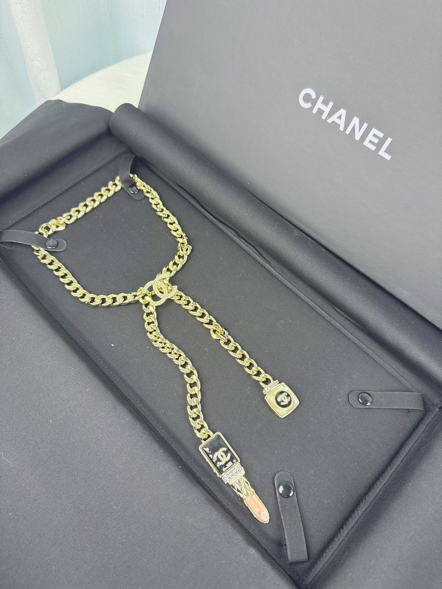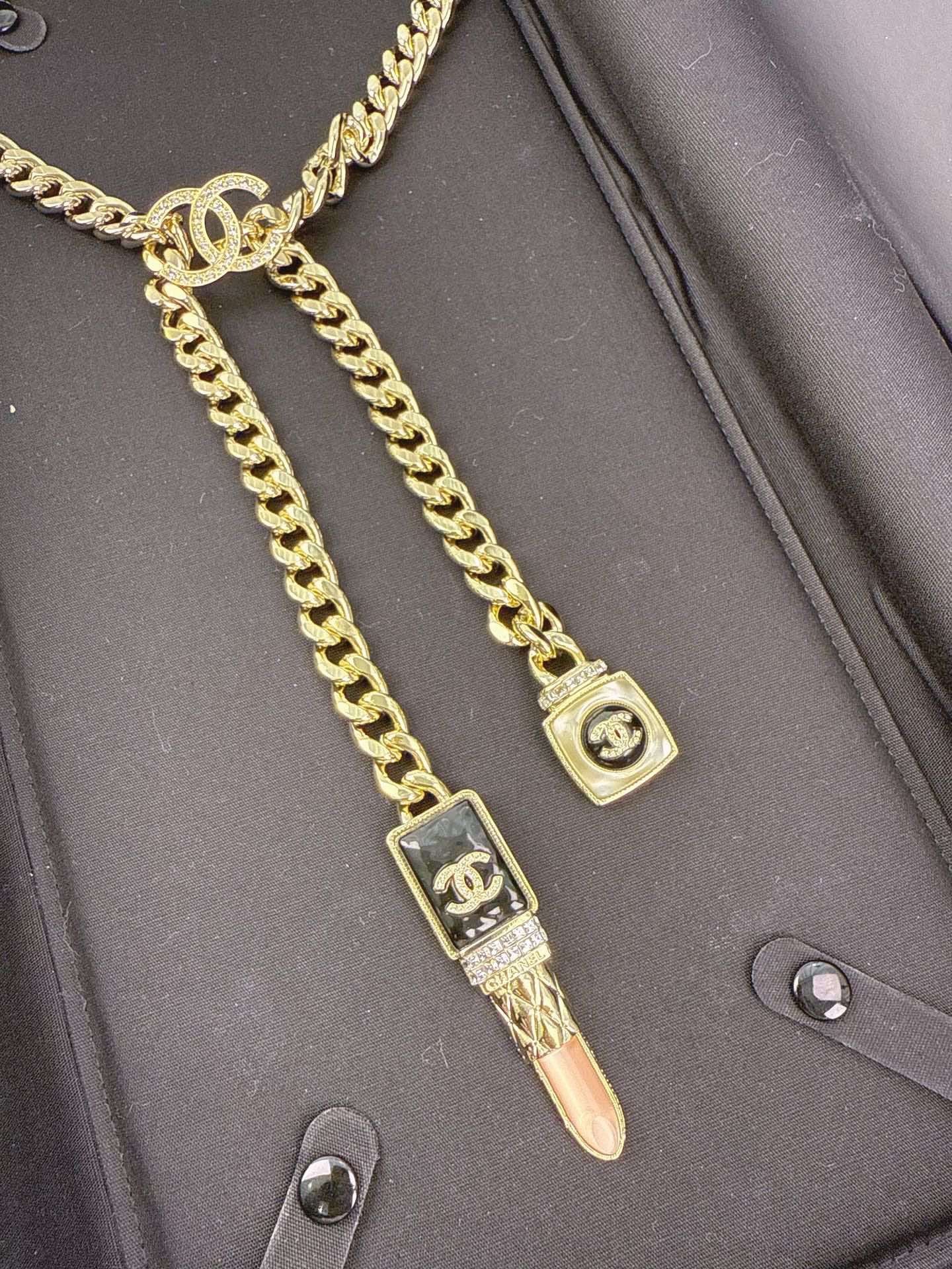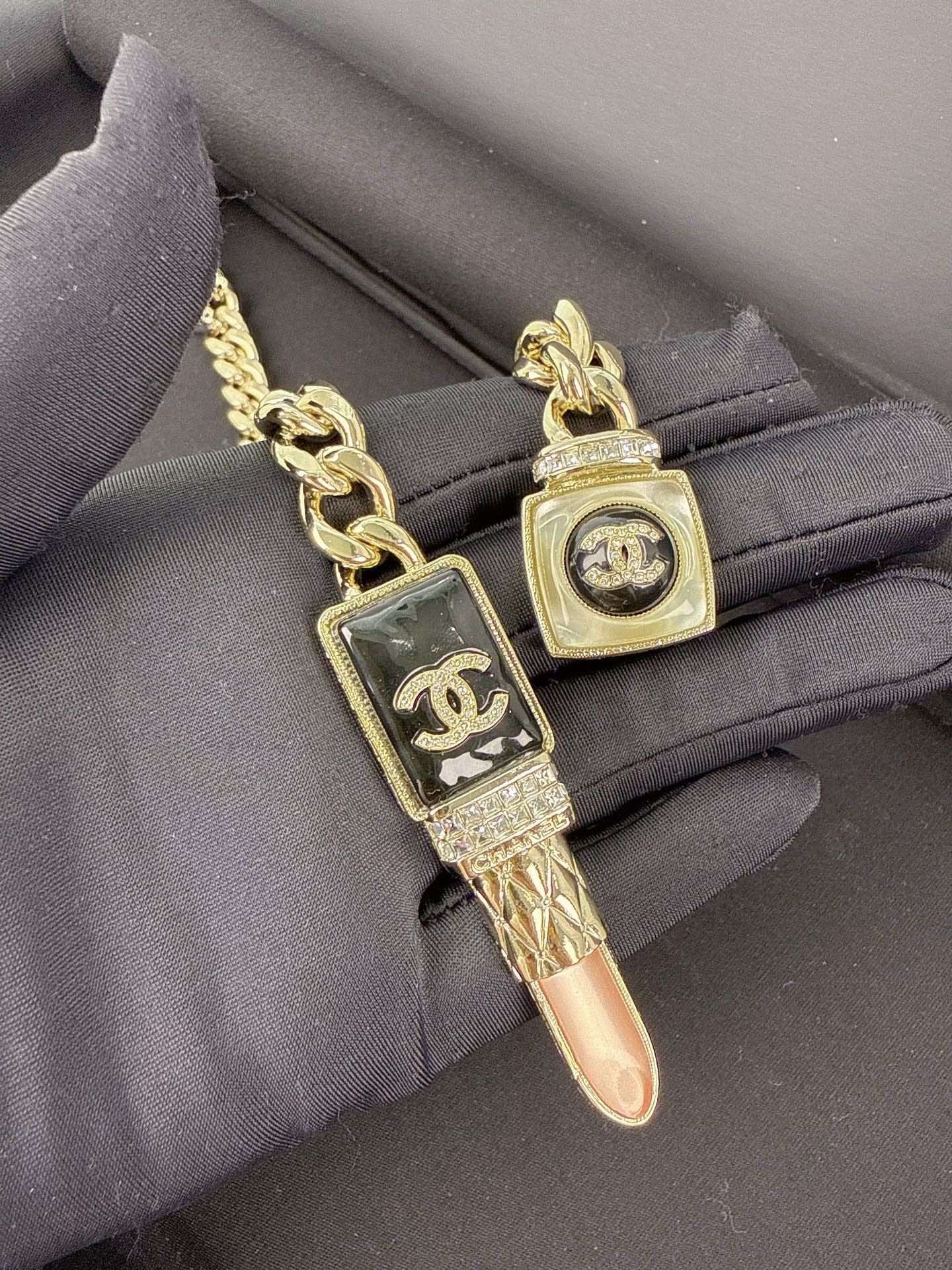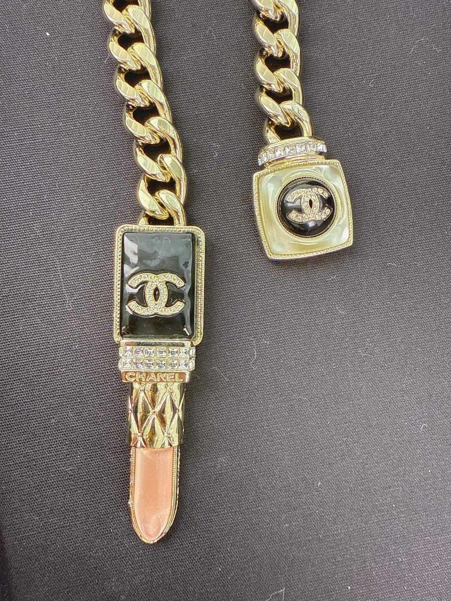 This eye-catching CHANEL necklace features a playful lipstick and perfume bottle pendant design, rendered in elegant gold-tone metal with striking red and black enamel accents. A chic and collectible accessory that adds charm and personality to any outfit.