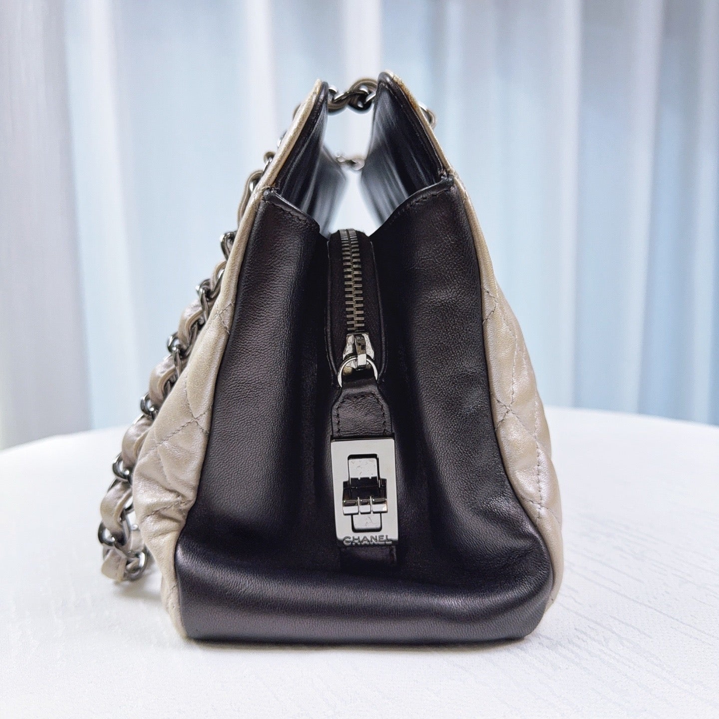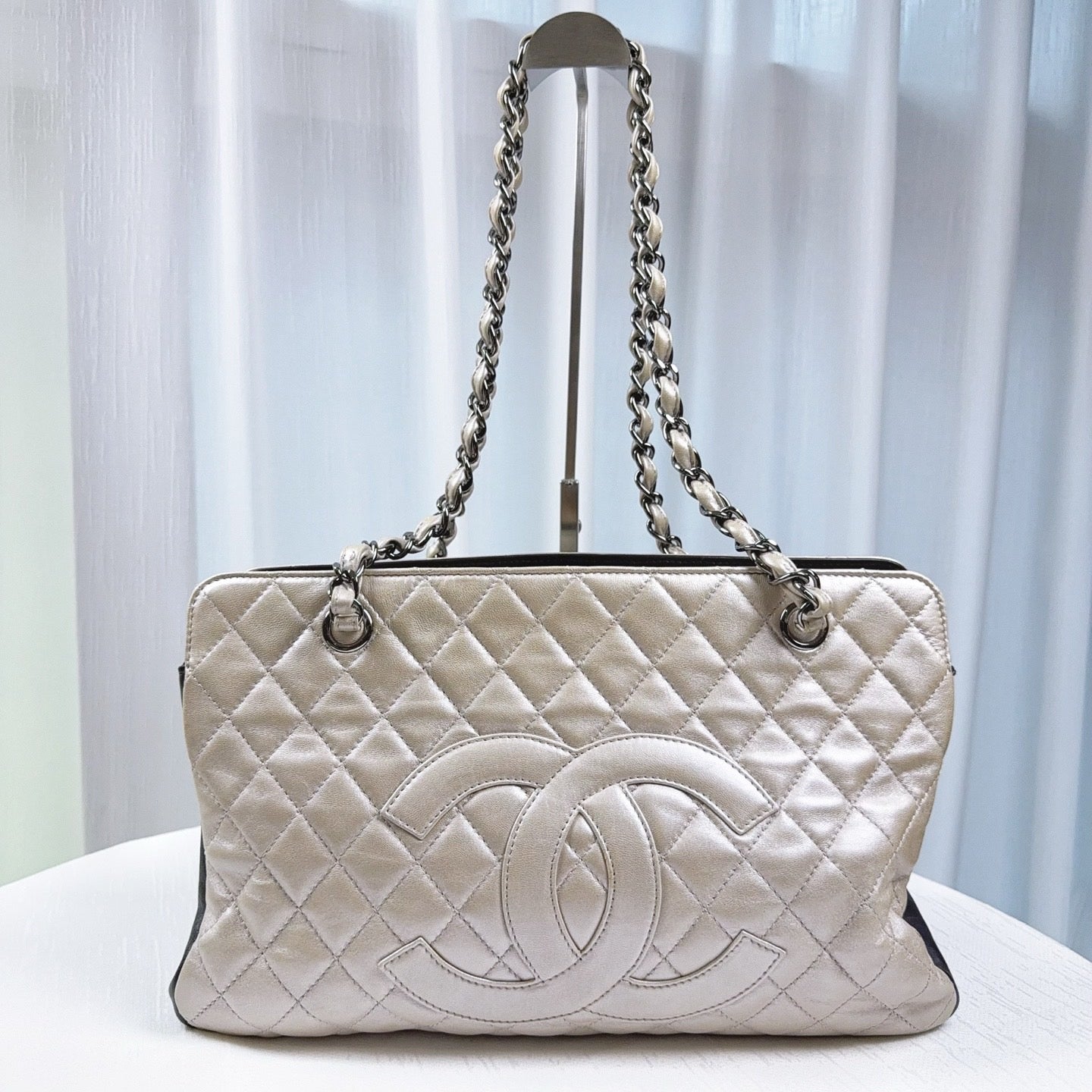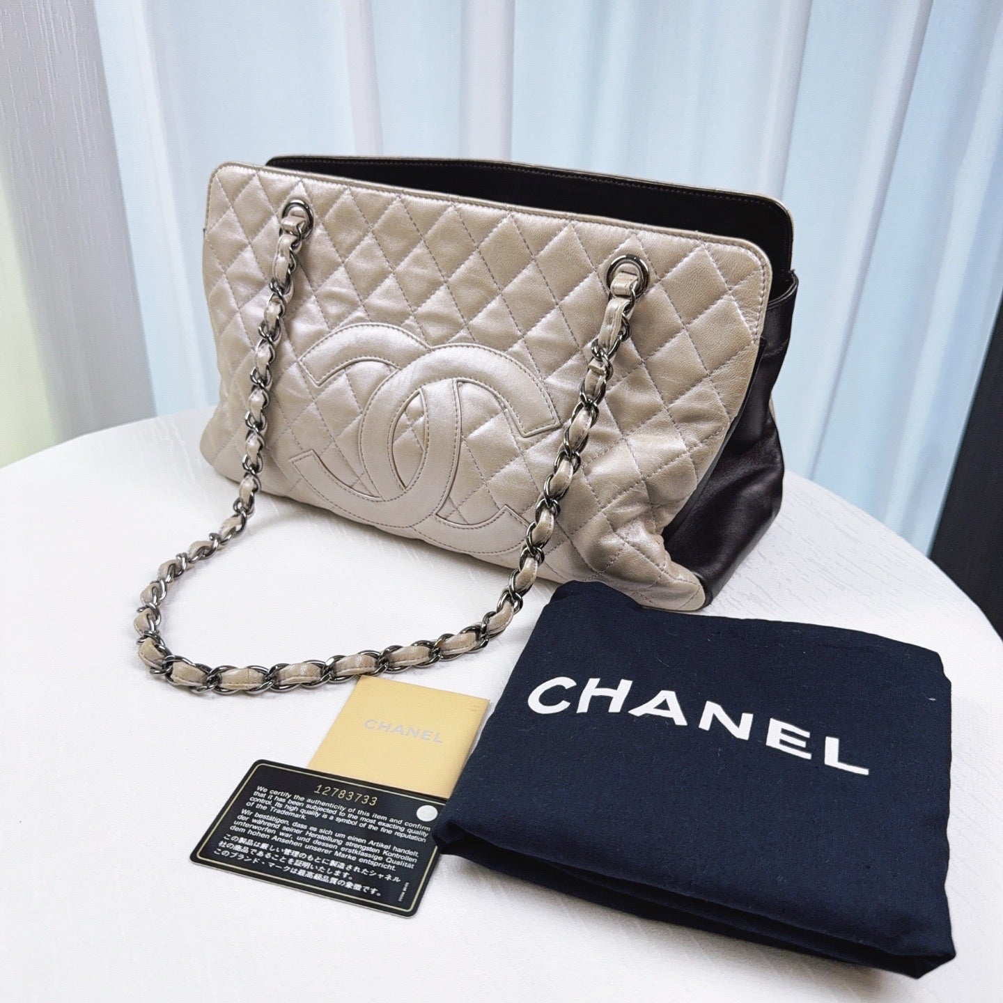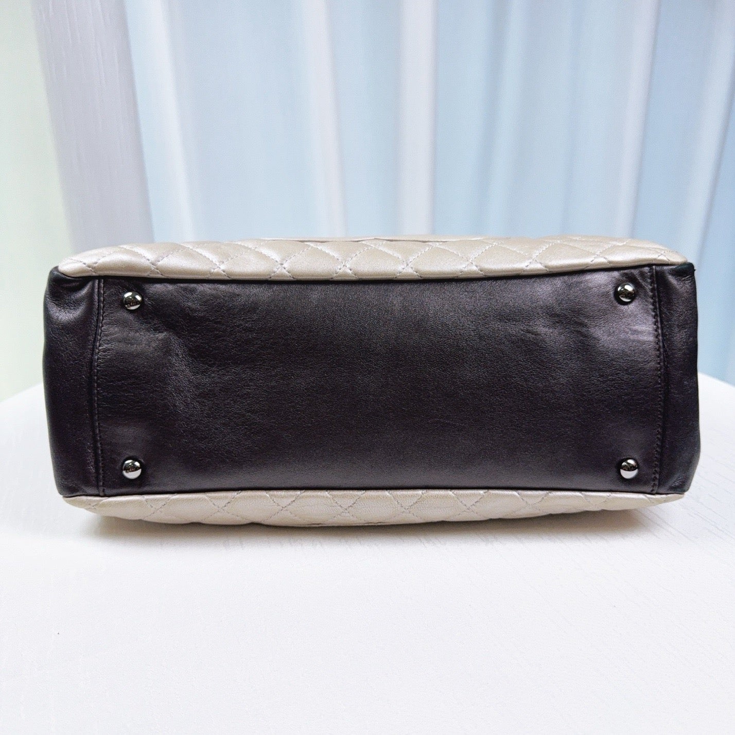 這款經典 CHANEL GST 中號手提包以少見的黑白拼色(俗稱熊貓配色)呈現,選用耐用的荔枝紋牛皮搭配銀色金屬配件,容量大又不失挺拔線條感,適合日常通勤與精緻造型。這款配色極其稀有,收藏價值與實用性兼備,是香奈兒手袋中的不敗經典。