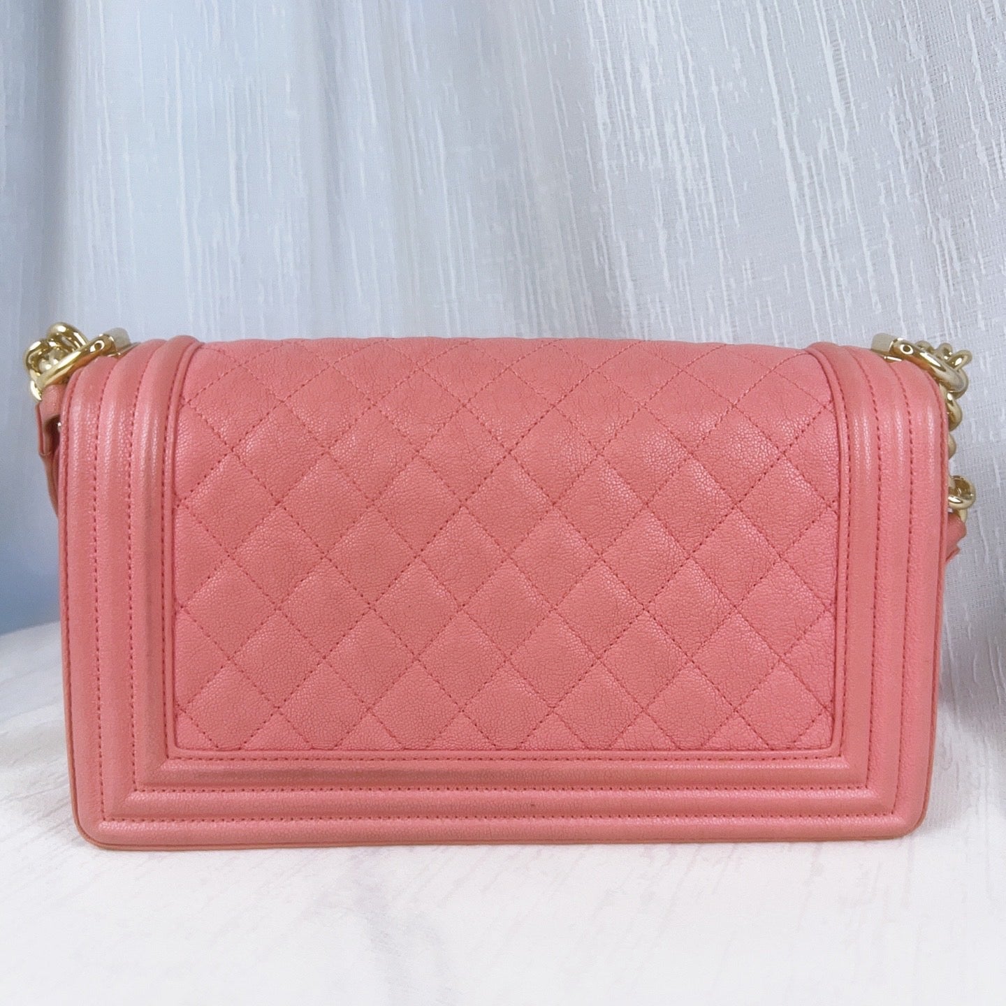 這款 CHANEL Le Boy 中號包,以粉嫩荔枝皮搭配金色金屬配件,是香奈兒四大金剛之一。結構俐落又不失女性魅力,是許多藏家與時尚愛好者爭相入手的熱門款式,公價高達五萬以上,入手不虧,兼具顏值與保值性。