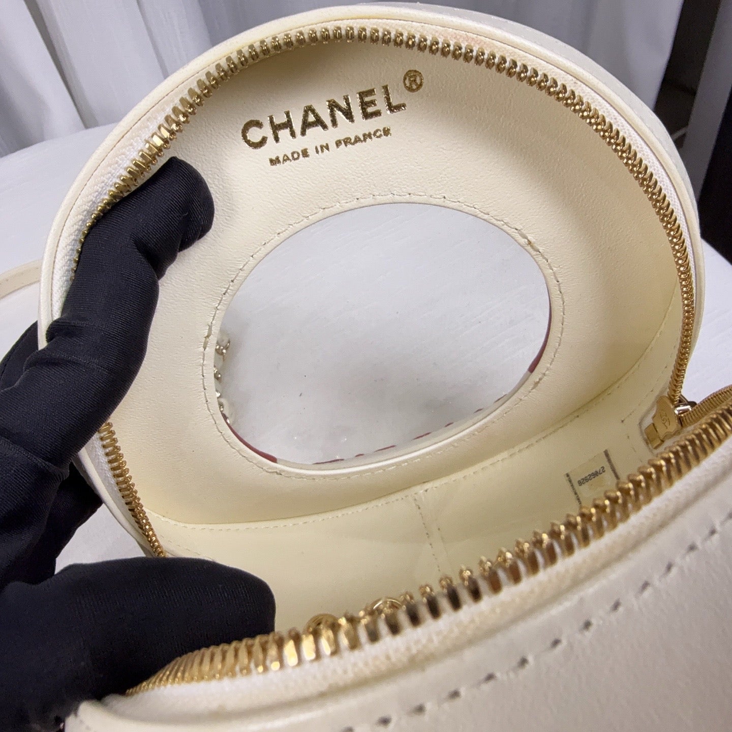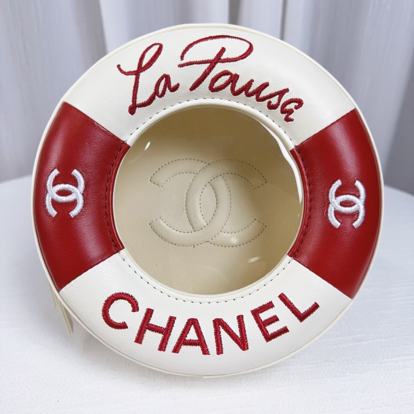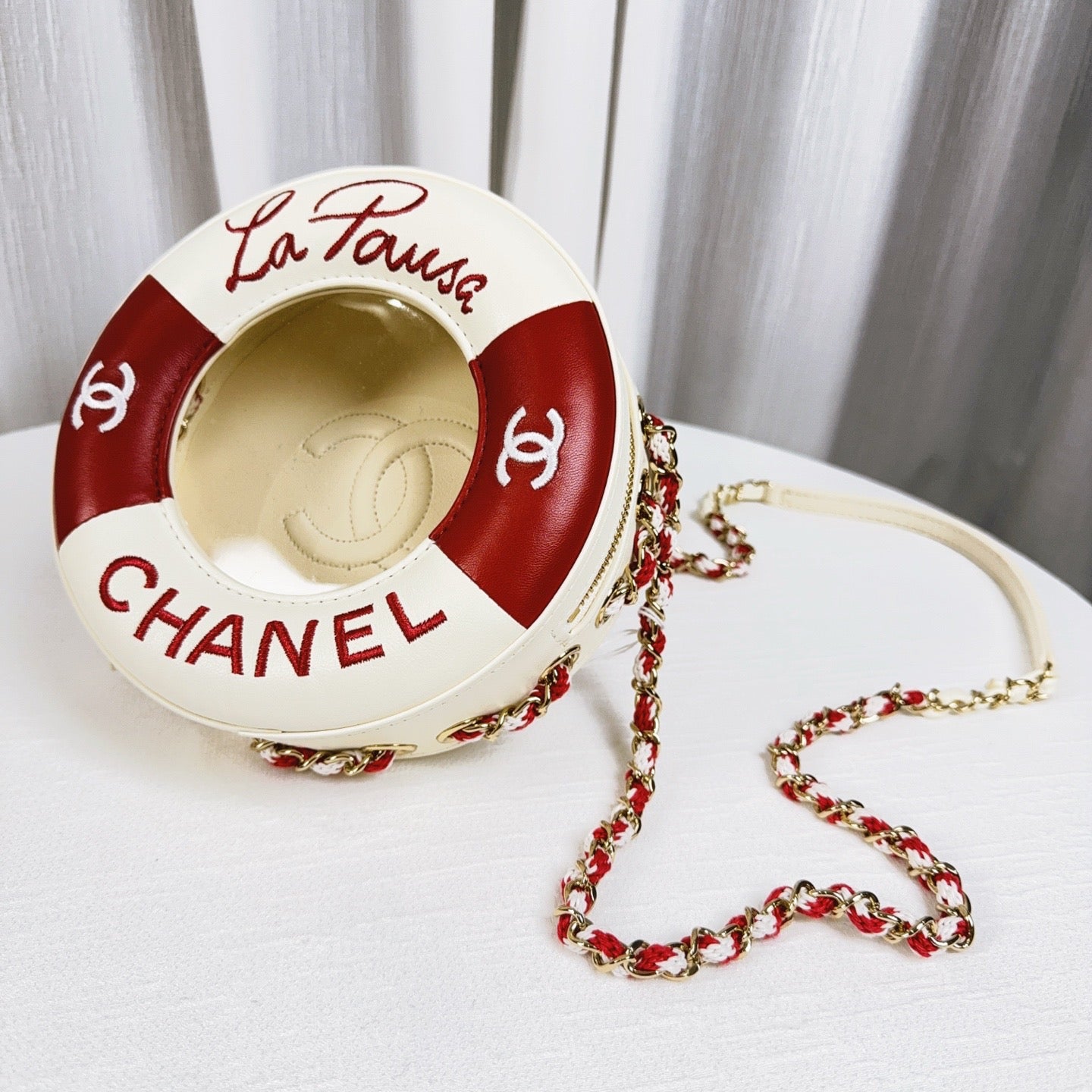 這款來自CHANEL走秀系列的圓餅包,以紅白刺繡游泳圈造型搭配透明PVC材質,趣味與時尚感兼具。銀色鏈條背帶設計,造型吸睛,極具收藏價值。是一款不容錯過的限量秀場單品。