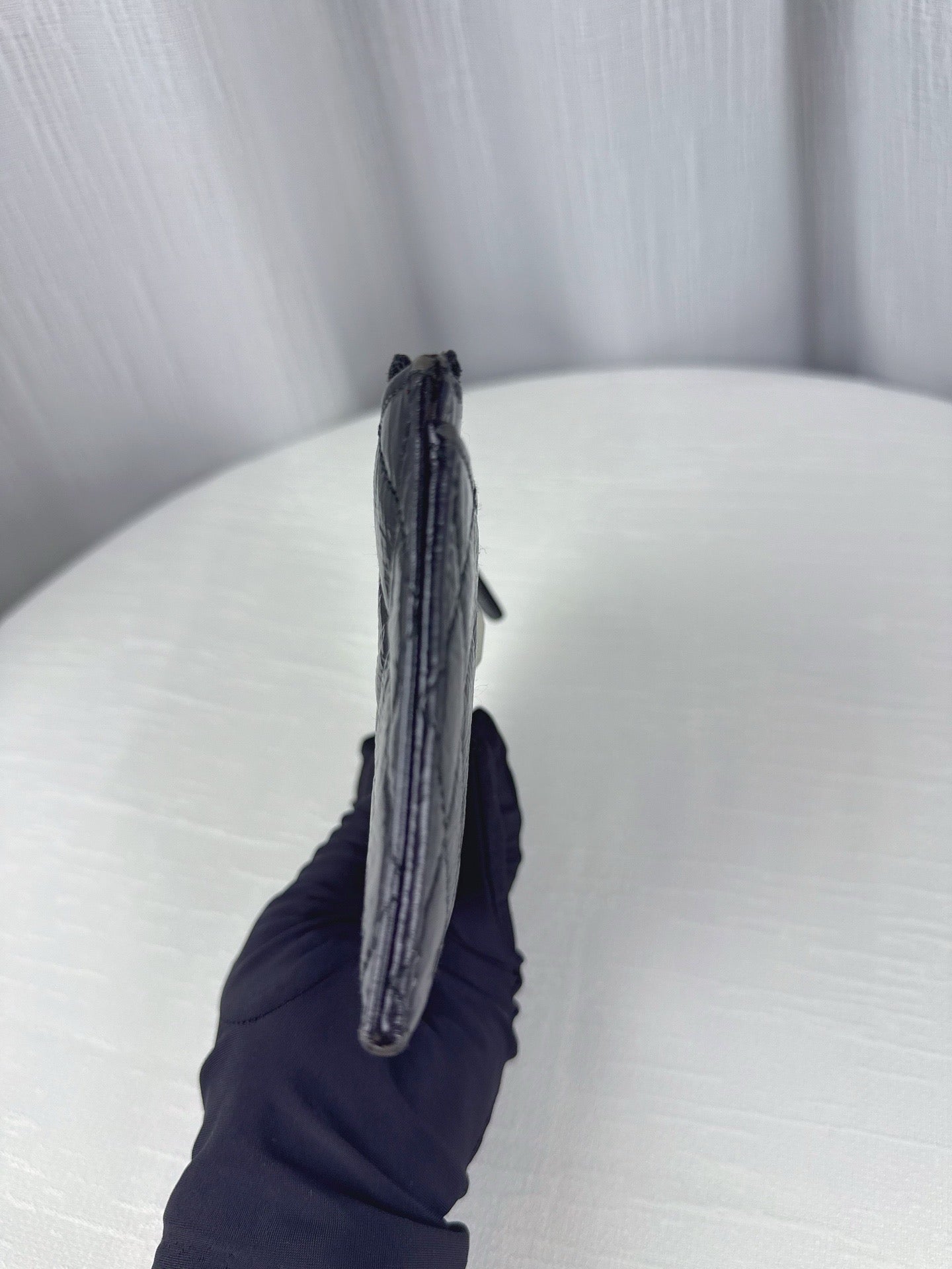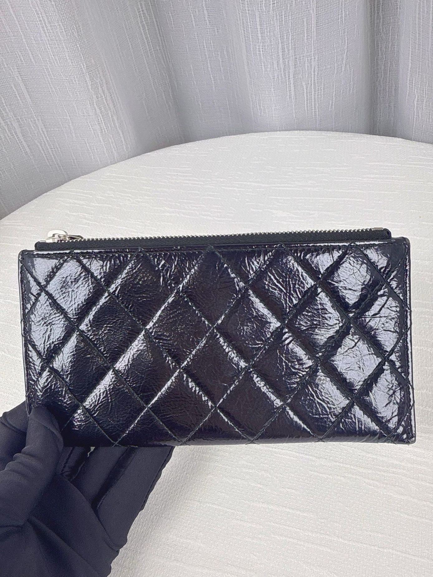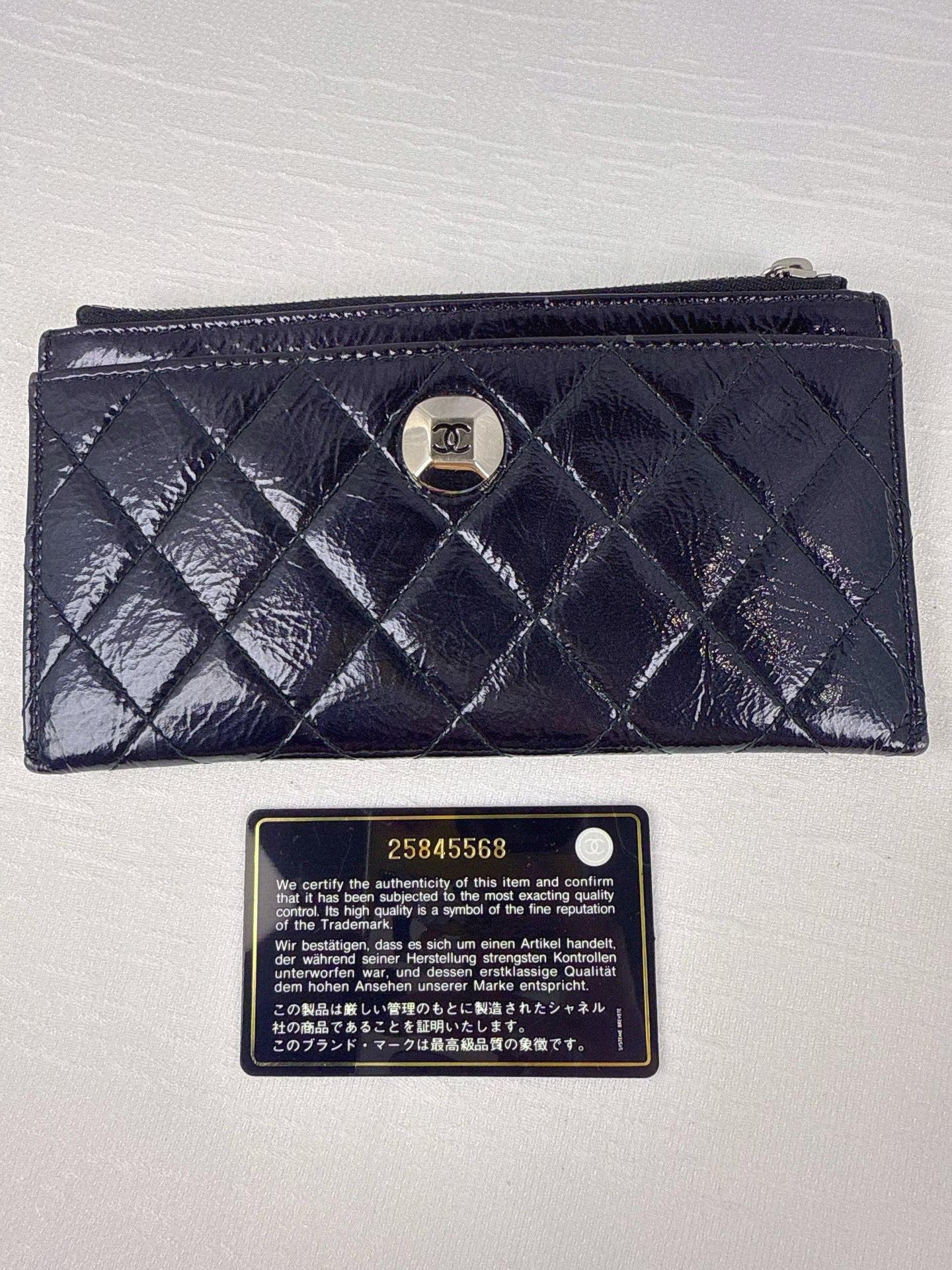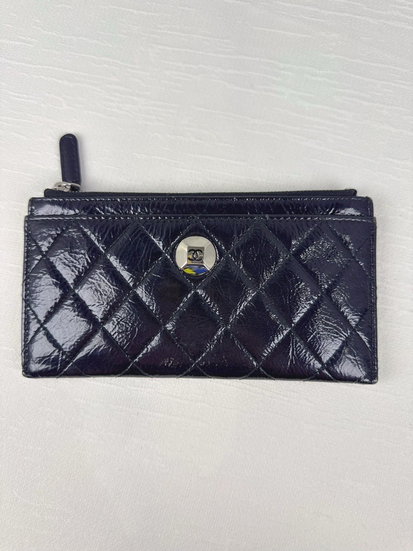 這款 CHANEL 長款卡包以銀色復古羊皮打造,手感柔軟,外觀閃耀金屬質感,內部設有多達 25 個卡槽與實用零錢袋,兼具功能與品味,是日常使用與典藏收藏的絕佳選擇。