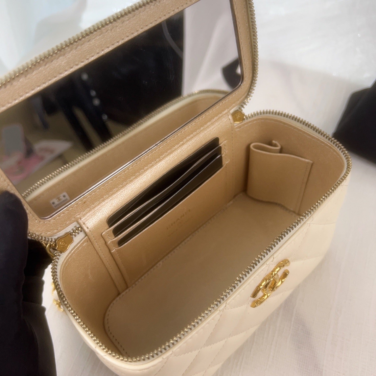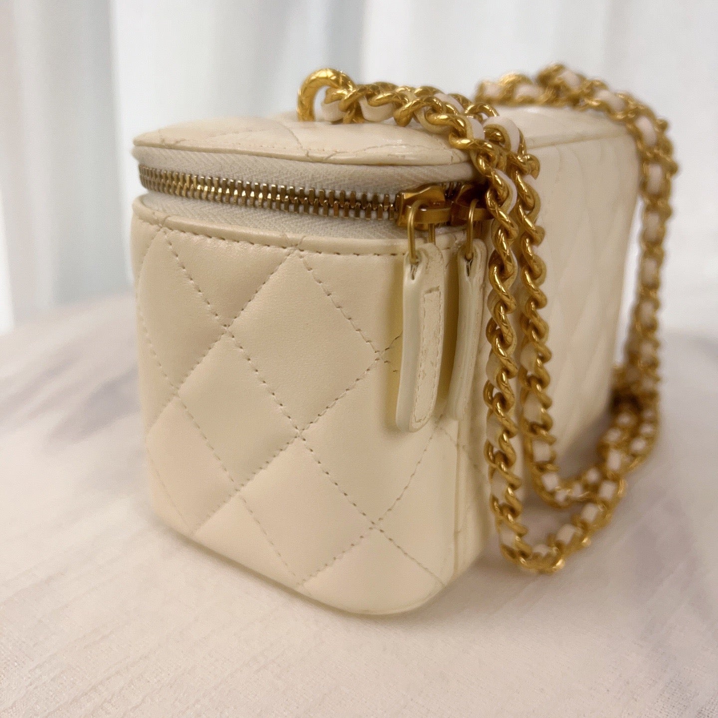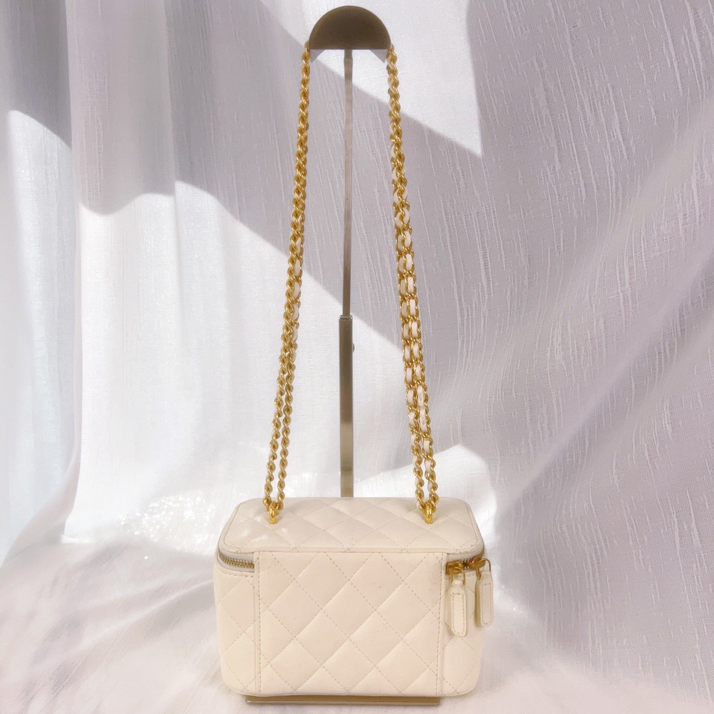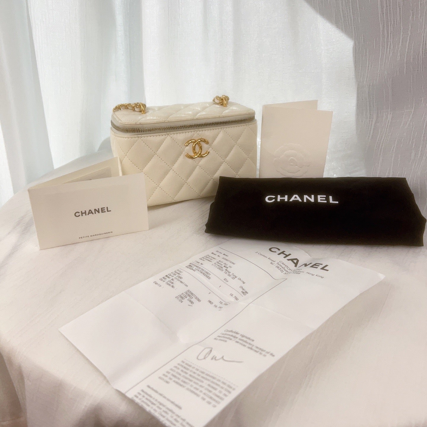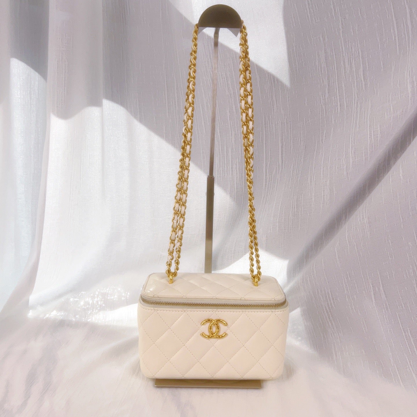 這款 CHANEL 白色荔枝皮菱格紋化妝盒子包,搭配金色雙C菠蘿造型鎖扣,外觀獨特又不失優雅。盒型設計小巧實用,適合日常或旅行使用,無論搭配什麼造型都能輕鬆提升整體氣質。附防塵袋與購買票據,是值得收藏的實用單品。