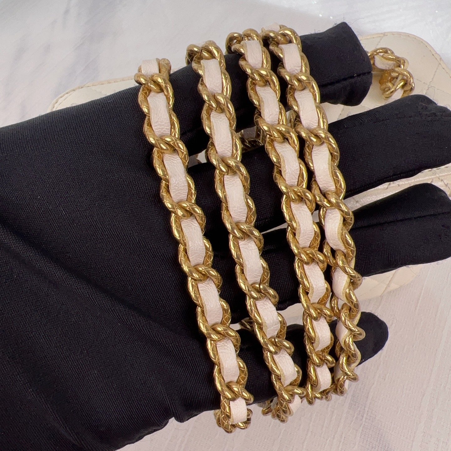 Color / Hardware: White with gold-tone hardware